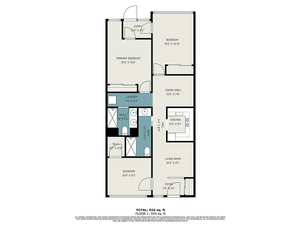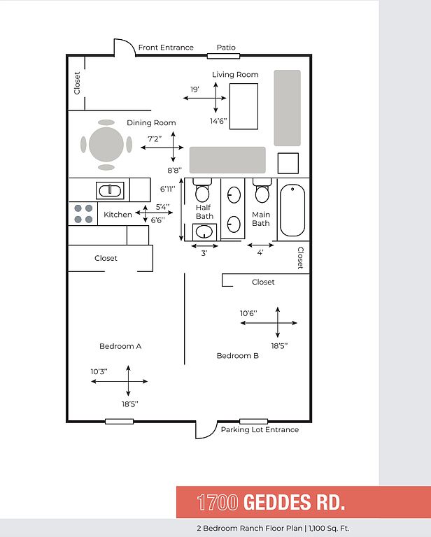 Ranch-style two-bedroom (each bedroom is divided into 4 equal spaces creating 2 extra bedrooms or offices).