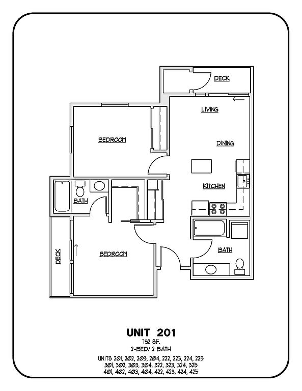 Open studio layoutsSolid wood cabinetryTwo-bedroom layoutsDeck and patio options