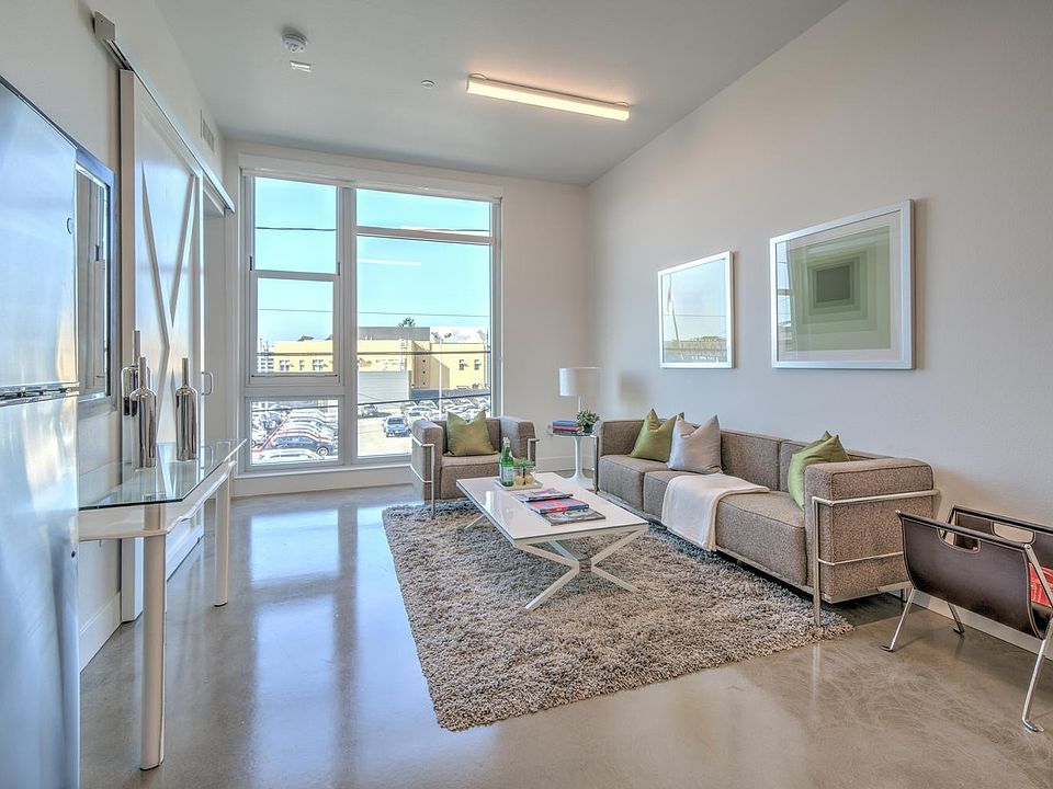 This beautiful and spacious two bedroom/two bathroom loft unit is equipped with high end appliances including a stainless steel refrigerator, gas stove, dishwasher and in unit washer and dryer. It also has an open concept kitchen, living and dinning area perfect for entertaining as well as a tranquil patio area for relaxing outdoors. The loft master suite has its own private sitting or office area in addition to its beautiful bedroom and bathroom. With polished concrete yet soft natural light, these lofts provide an industrial and traditional apartment setting for you to enjoy.