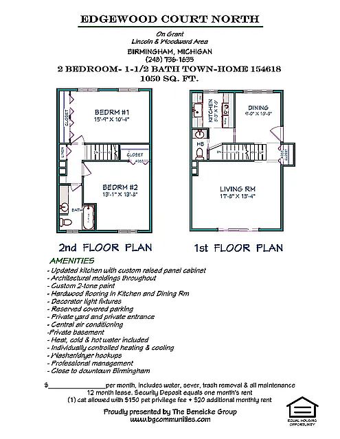 Studio apartments and 2-bedroom townhouses in Birmingham, MI, featuring full private basements with washer/dryer hookups, private backyards, and assigned parking (townhouses get two spots, one under a carport). Located in a friendly, family-oriented neighborhood near schools, parks, and downtown Birmingham. Gas, water, sewage, trash, and snow removal are all included, and residents enjoy 24-hour maintenance with an online portal for rent payments and service requests.