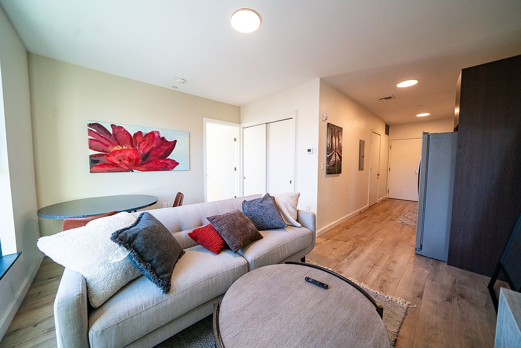 Sunlit luxuryQuartz countertopsModern kitchenIn-unit laundryStainless steel appliances