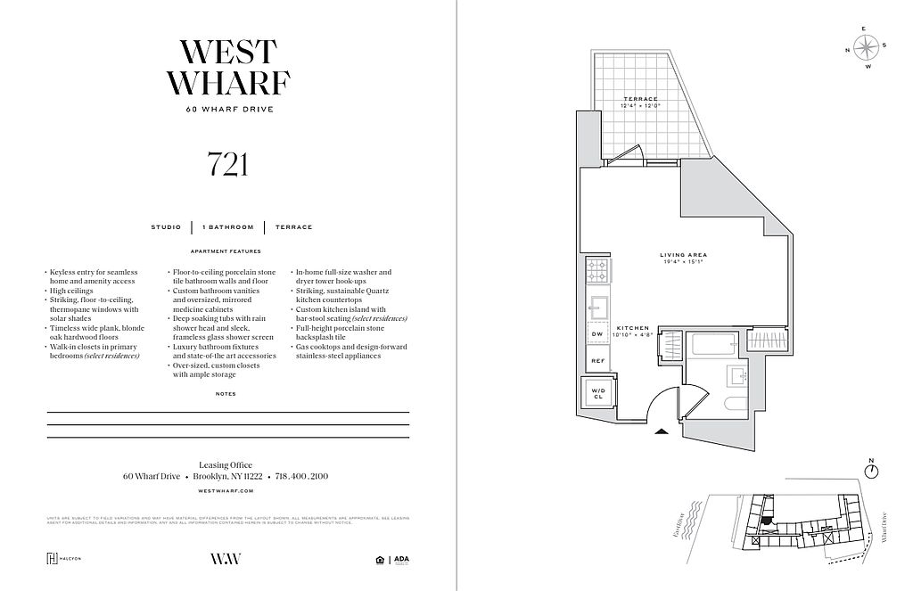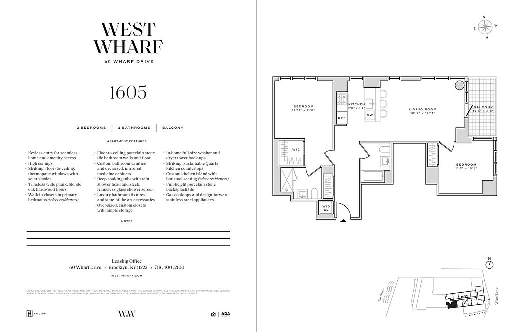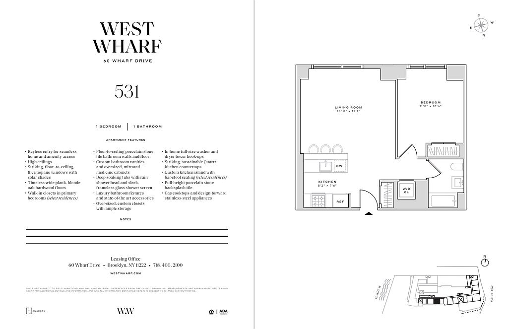 60 Wharf Drive living is defined by spacious apartment layouts, elegant finishes, and well-crafted finishes. Each pet-friendly residence offers keyless entry for seamless home and amenity access, 9'-0" ceilings (14'-0" ceilings in select residences), floor-to-ceiling windows for immersive views and daylight filled rooms, high-performance individual HVAC climate control for year-round comfort, wide-plank blonde oak hardwood floors, custom kitchen islands with bar-stool seating (select residences), luxury fixtures, gas cooktops, design-forward stainless-steel appliances, deep soaking tubs, rain shower heads, frameless glass shower screens and primary bedroom walk-in closets (select residences).