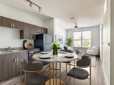 This two-bedroom apartment features laminate wood flooring for easy cleaning and comes with a full set of appliances, including a refrigerator, stove, microwave, dishwasher, and washer & dryerall included at no extra cost. Trash services are also provided.