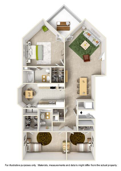 Need more details about your future home? Covering between 861 and 1,822 square feet, our residences are available in standard or townhome layouts. When you're ready to step out for some relaxation, enjoy our scenic walking and running trails, resident lounge with a billiard area, and resort-style, poolside cabanas. Even furry pals will have a great time, thanks to the paw park with agility equipment.