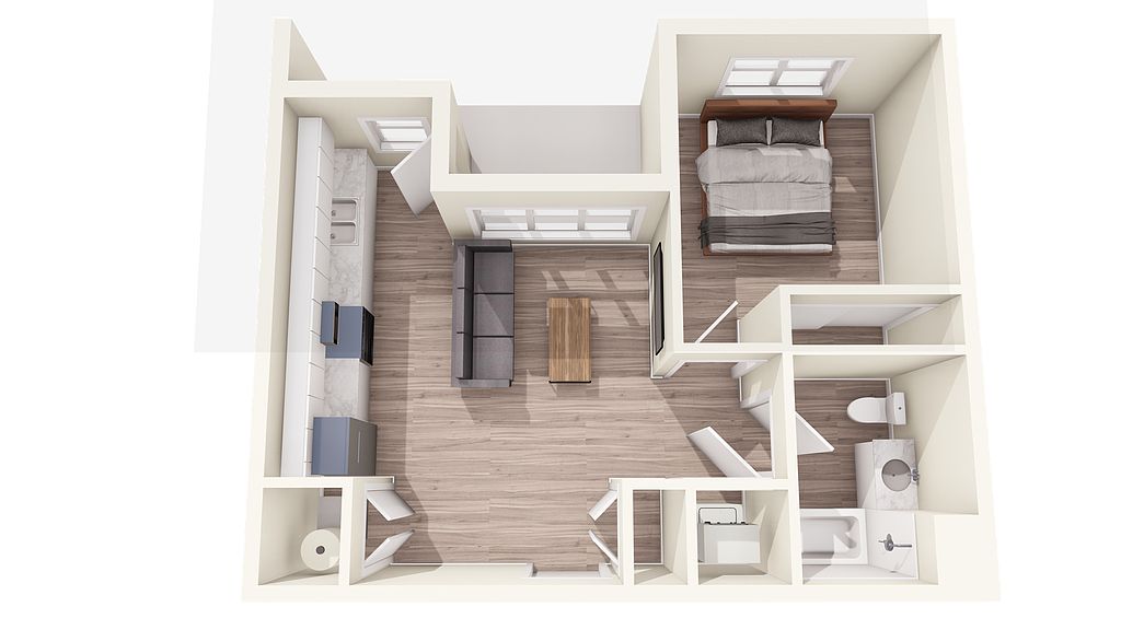 In-unit washer and dryerQuartz countertopsModern lightingNine-foot ceilingsStylish one-bedroom unitsStainless steel appliancesHardwood floors