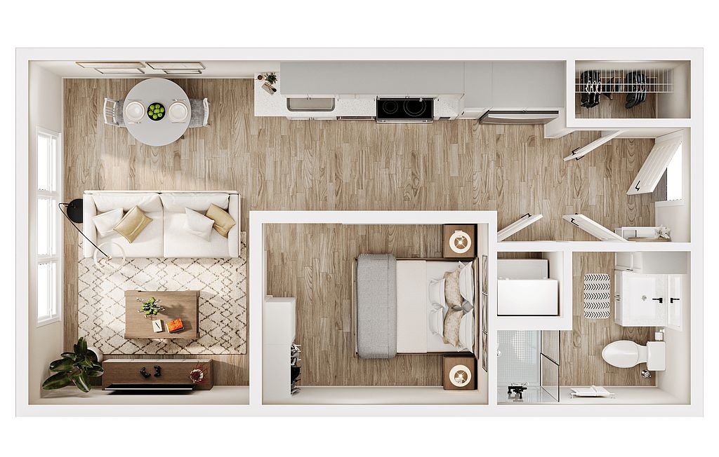 - Wood: Wood flooring throughout