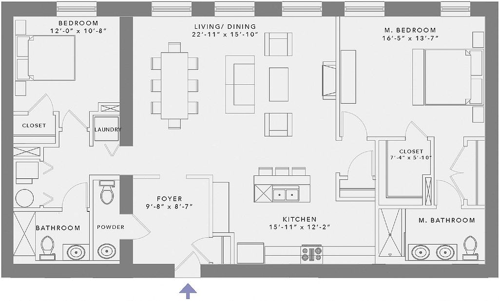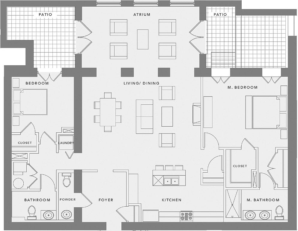 Each Apartment has 14 foot ceilings with large Big Air ceiling fans, Bosch gourmet appliance package, exposed ductwork, 8ft solid core doors, tiled bathrooms and back splashes, stone countertops, roller blind window coverings, in-unit central forced heat and air conditioning, in-unit laundry, walk-in closets, fireplaces, and oversized windows.
