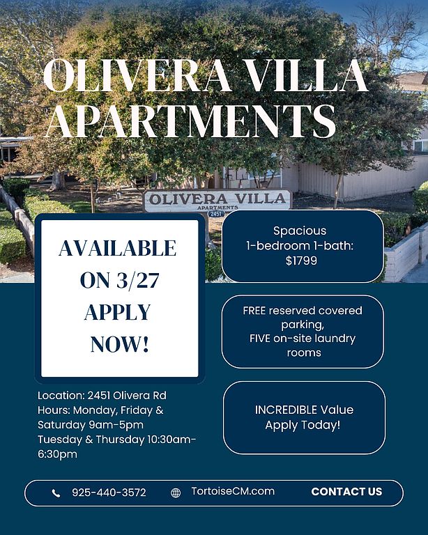 Discover your new home at Olivera Villas, where convenience meets comfort. We are just minutes away from major highways 242 and 4, and within walking distance of the North Concord BART station. You'll also find several restaurants and shops just steps away at the Olivera Crossing Shopping Plaza (featuring Planet Fitness & 7/11).