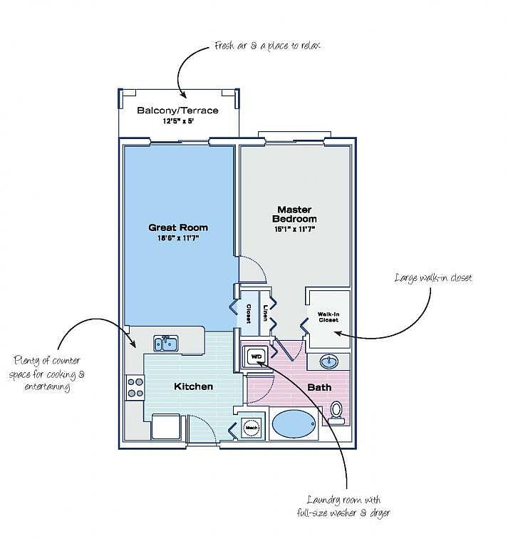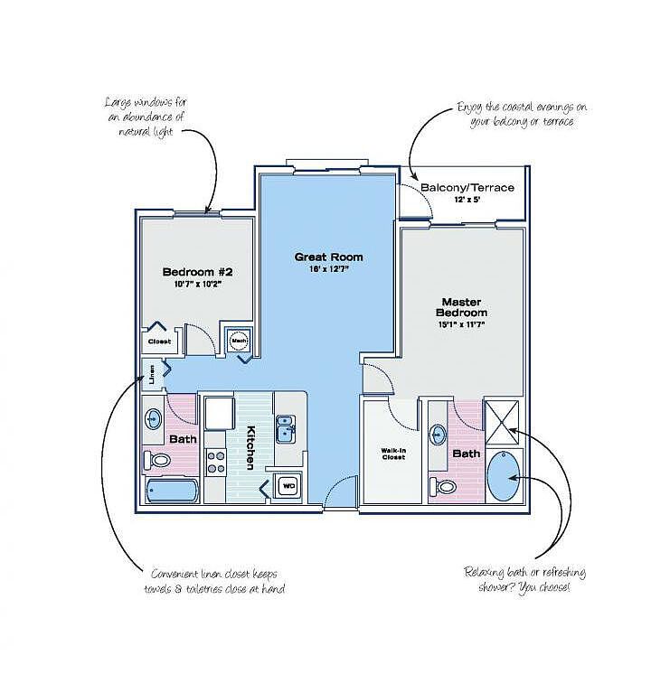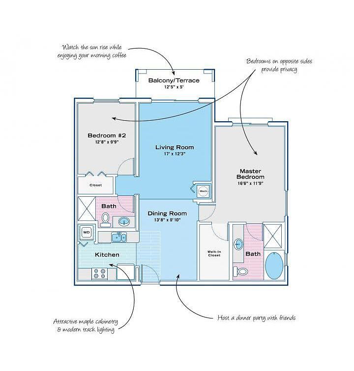 - Patio Balcony: Private balconies/terraces with sliding glass door