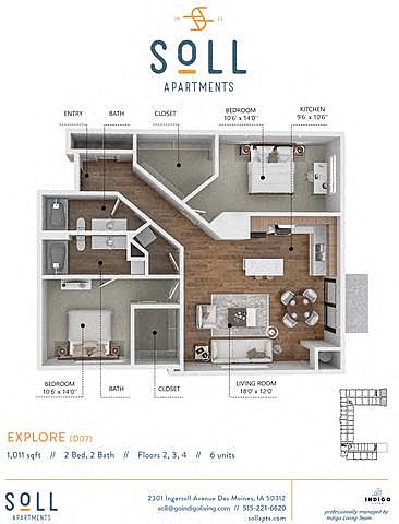 Welcome home to Soll Apartments! Our apartments and townhomes in Des Moines allow you to reside in comfort and sophistication while exploring the unique and dynamic culture of downtown Des Moines. Superior amenities, desirable services, and a well-connected address allow you to indulge in all the urban conveniences you want without giving up on the peace and quiet you deserve. You'll enjoy beautiful landscapes, thoughtful amenities, and outstanding services that will enhance your daily life. Schedule your appointment, or drop by for a personal tour today! We can't wait to welcome you home to Soll Apartments!
