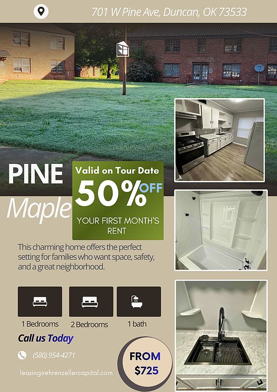 Welcome to Pine Maple Apartments, a conveniently located residential community in the heart of Duncan, Oklahoma. Situated on West Pine Avenue, this property offers easy access to local shopping, dining, schools, and major roadways, making everyday living simple and efficient. Pine Maple Apartments provides comfortable apartment living in a quiet, established neighborhood. The property is ideal for tenants seeking a balance of affordability, convenience, and a central location. With nearby parks, local employers, and community amenities just minutes away, residents enjoy both comfort and accessibility.