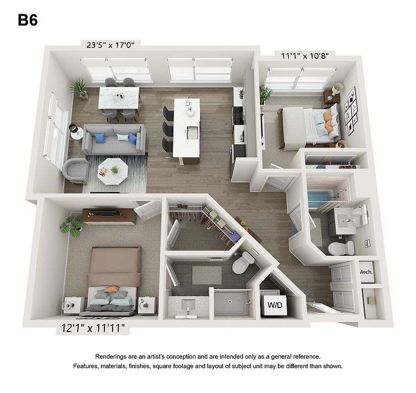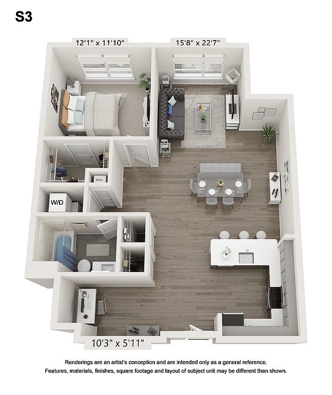 Quartz countertopsFloor-to-ceiling windowsFull-size washers and dryersHardwood-style plank flooringStainless steel appliances