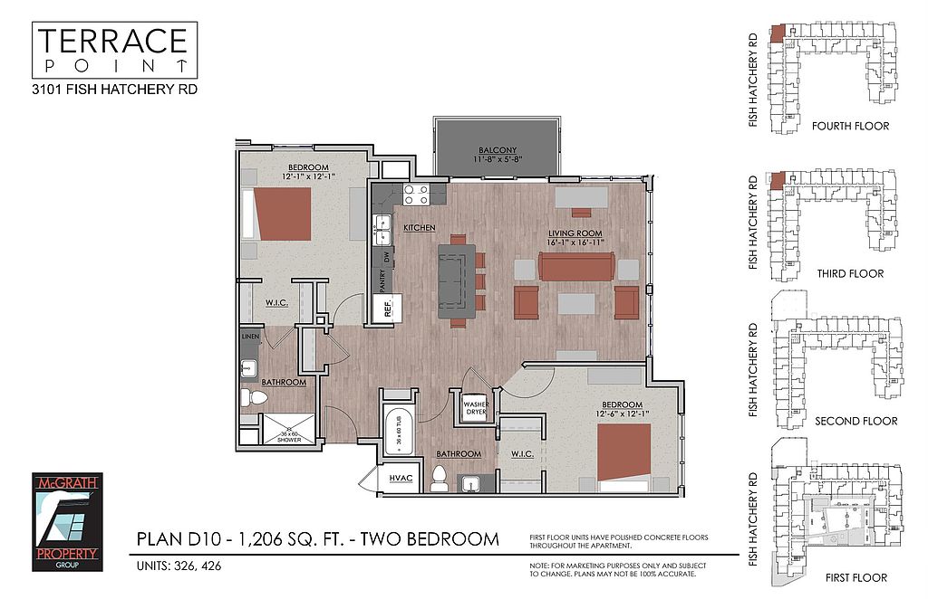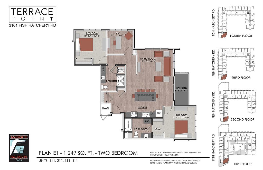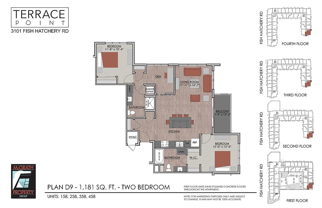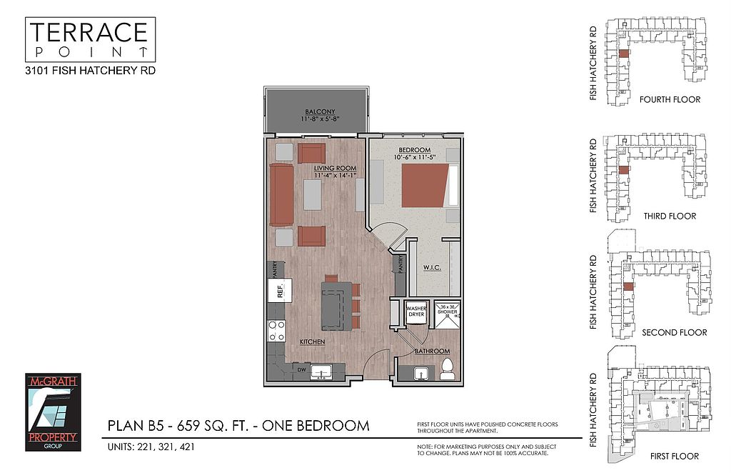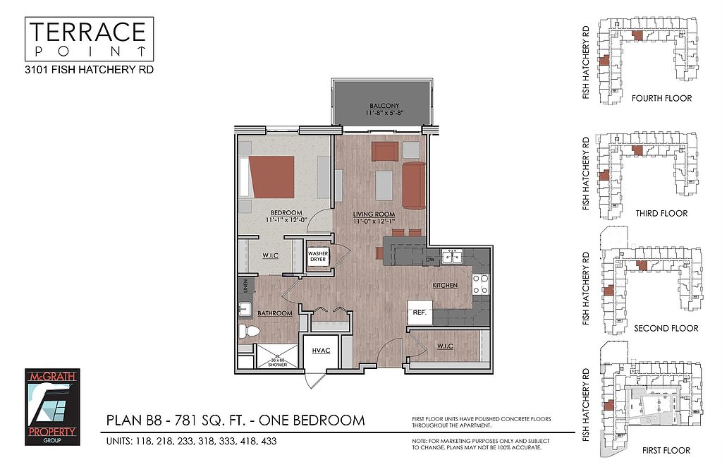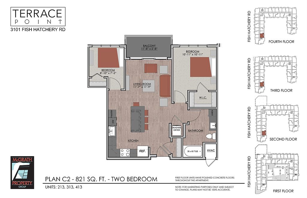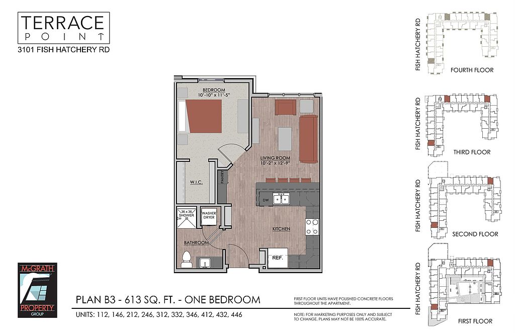 Terrace Point features modern clean design, white cabinets, quartz countertops and beautiful bright windows. Living here you will enjoy an abundance of common areas including a large outdoor courtyard, fire pits, grills, 24/7 fitness center, yoga room, dog wash station, off leash dog run and more! This building is in a great location for someone looking to be closer to downtown, but on the west side. The building is conveniently located on Fish Hatchery Rd and only a 5 minute drive to the Beltline!