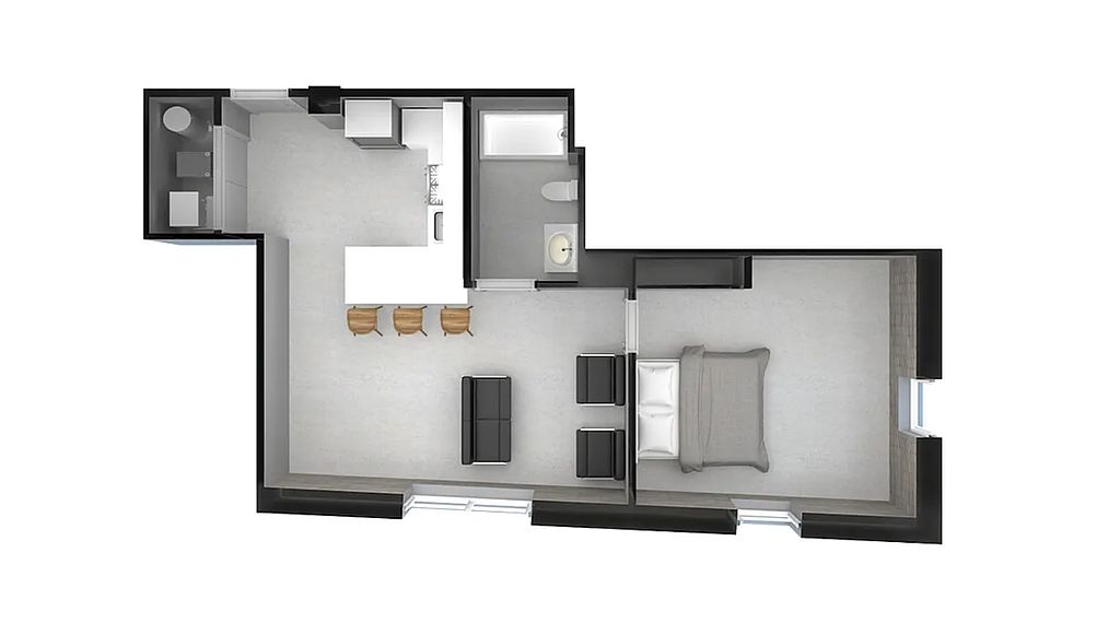 Finished in an urban loft style, the polished concrete floors, 15-foot ceilings, and exposed brick walls reveal the historical character of the building while quartz countertops, white acrylic cabinets and stainless steel appliances provide a modern touch. The ground floor units feature floor to ceiling windows with bedrooms perched on mezzanine floor levels.