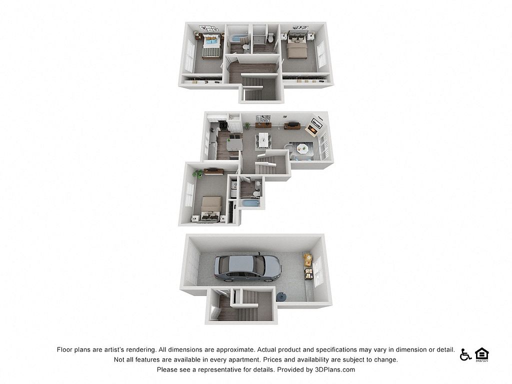 Price shown is Base Rent. Residents are required to pay: At Application: Application Fee ($44.00/applicant, nonrefundable); At Move-in: Security Deposit (Refundable) ($300.00/unit); Monthly: Electric (usage-based); Sewer (usage-based); Trash-Doorstep ($10.13/unit); Trash-Hauling (varies); Water (usage-based); Renters Liability Insurance-3rd Party (varies). Please visit the property website for a full list of all optional and situational fees. Floor plans are artist's rendering. All dimensions are approximate. Actual product and specifications may vary in dimension or detail. Not all features are available in every rental home. Please see a representative for details.