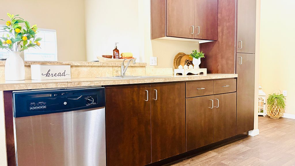 Brand new rich wood grain vinyl flooring in your kitchen dining room and restroom.