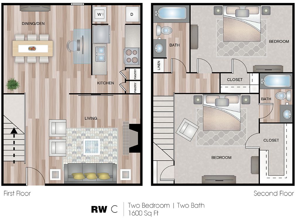 Our Regents Walk Townhomes range from 2 to 4 bedroom models, and range between 1,400 to 2,400 spacious square feet. Regents Walk is full of character with each unit sporting its own unique traits. With so many options to choose from, you're sure to find a new home that's right for your family. These spacious and pet-friendly townhomes feature many individualized details that will charm you, including crown molding, full size washer and dryer connections, huge walk in closets, and private patios and yards. Some of our Regents Walk Townhomes are even more distinctive with built-in mini bars, decorative fireplaces, brick bookshelf space, separate dining rooms and so much more.