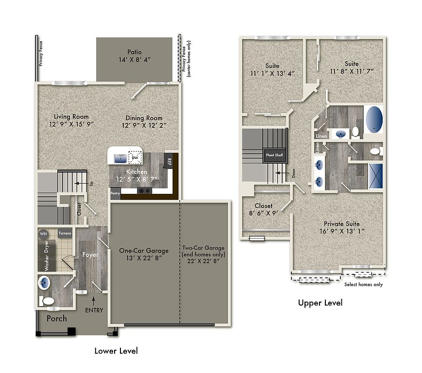 Inside each home, you'll find modern, open floor plans with upscale finishes including woodgrain flooring, quartz countertops, 42-inch cabinetry, stainless steel appliances, high ceilings, and oversized closets. Select homes feature private entrances, direct-access garages, and beautiful views of the community's manicured green spaces.