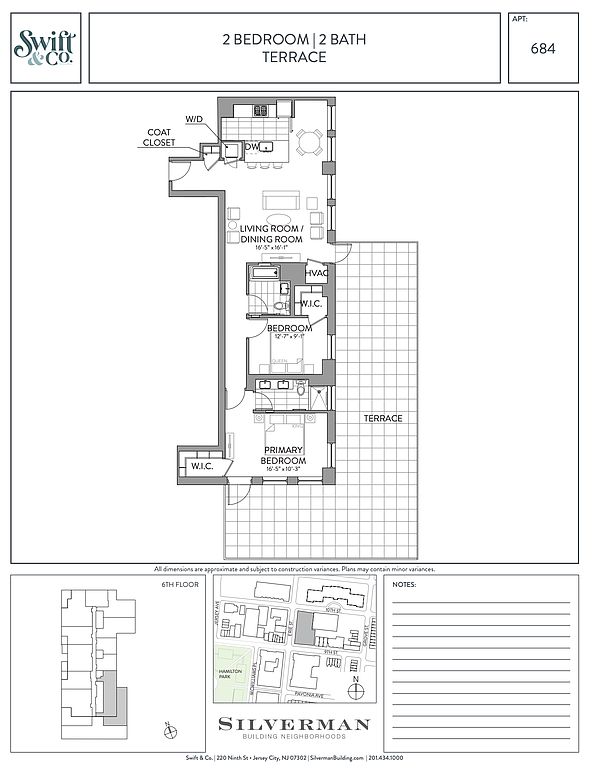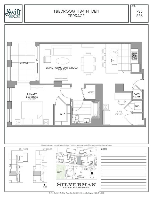 Swift & Co., the newest building development from SILVERMAN, is a nine story, mixed-use building, one block from the centerpiece of the historic district's five acre Hamilton Park. Swift & Co. offers studio, 1, 2 and 3 bedroom apartments, many of which are outfitted with terraces and sweeping views. Apartment features include cove lighting, washer and dryer, walk-in closets and other special touches adding warmth and spaciousness.