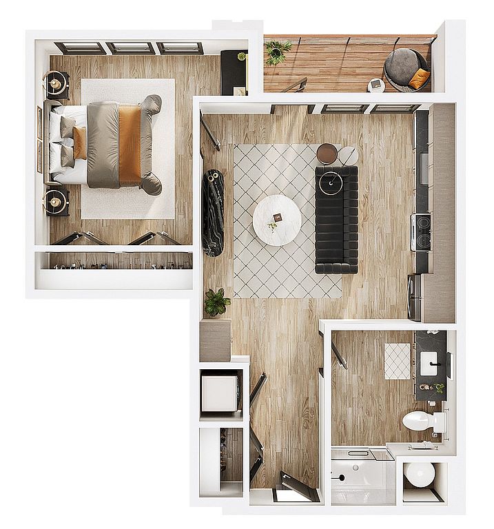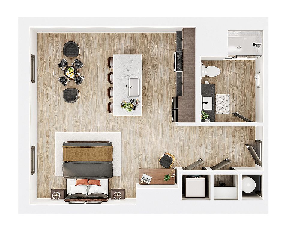 Each apartment is designed for contemporary comfort with open layouts, oversized windows, high ceilings, private balconies, premium finishes, and smart-home technology. Residents will enjoy resort-style amenities including a pool with river views, outdoor courtyards, and co-working lounges.