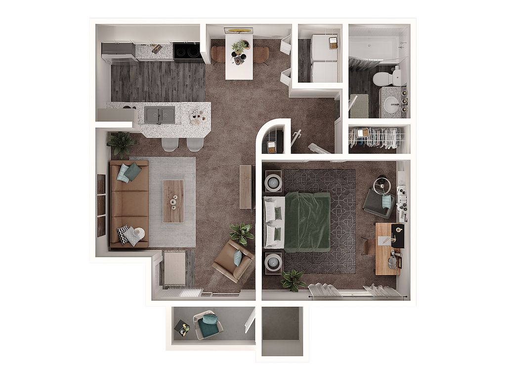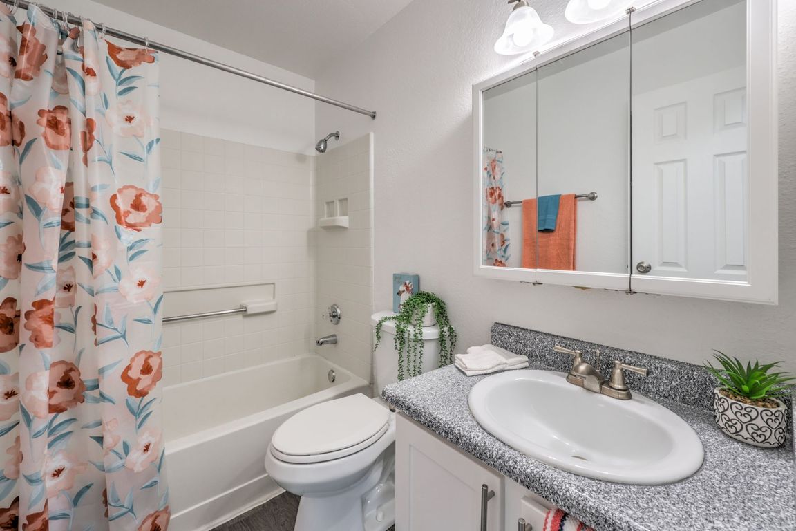 Private patio or balconyFaux wood blindsFull-size washer and dryerFossil-stone backsplash tileCentral air and heatBrushed-nickel hardwareStainless steel appliances