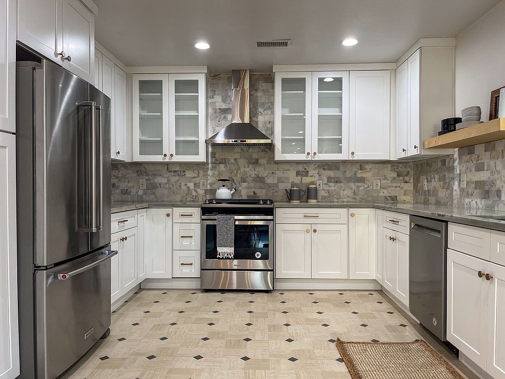 The kitchen is fully equipped with stainless steel appliances, including a stove, refrigerator, dishwasher, and range hood, making everyday cooking and entertaining easy. Window coverings are included for added privacy, and a garbage disposal adds extra convenience.
