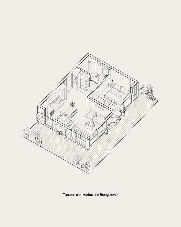 SuperBungalows are a modern take on bungalow court homes. With no shared walls and large private terraces, we have prioritized bringing natural light, air, and nature into your home.