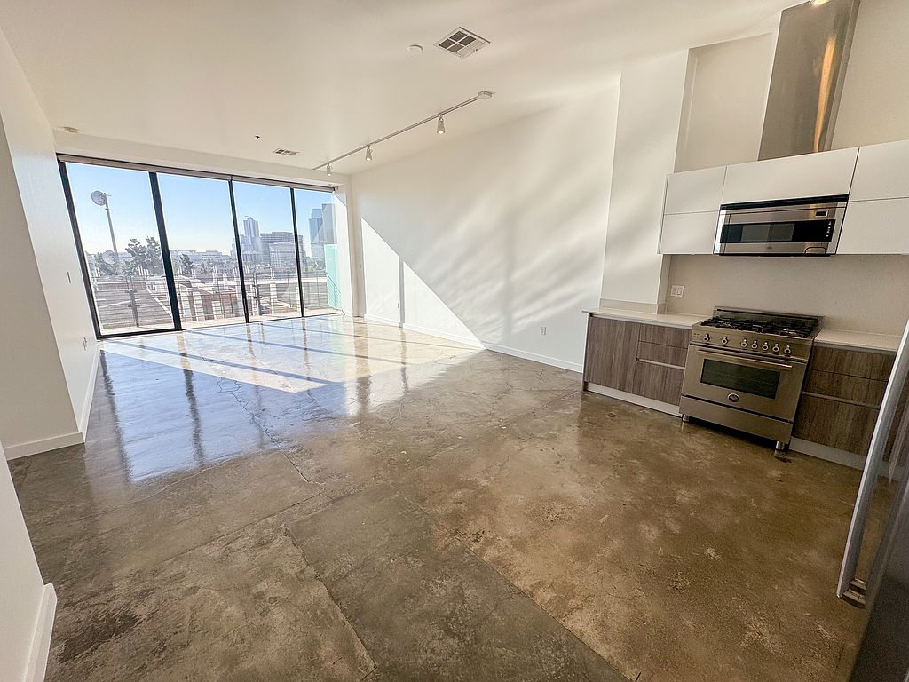 All of our units are bright and open plan lofts with long balconies and, in the case of corner units, wraparound balconies. The penthouse level boasts double height ceilings and private roof sundecks for these 2 story units at the top of the building. From the downtown skyline to the Hollywood sign, views here are completely singular and offer an impressive experience for your guests. The floor-to-ceiling insulated windows are all outfitted with custom made motorized UV resistant Mecho shades. Most floor plans are polished concrete (hardwood and tile on the penthouse level).