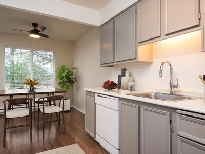 Our 2 and 3 bedroom apartment homes are designed with your comfort in mind. Each apartment is PGE "Super Good Cents" energy efficient, and your rent includes water, sewer, and garbage. Enjoy the convenience of hassle-free parking and the natural beauty of rolling lawns and trees between each building.