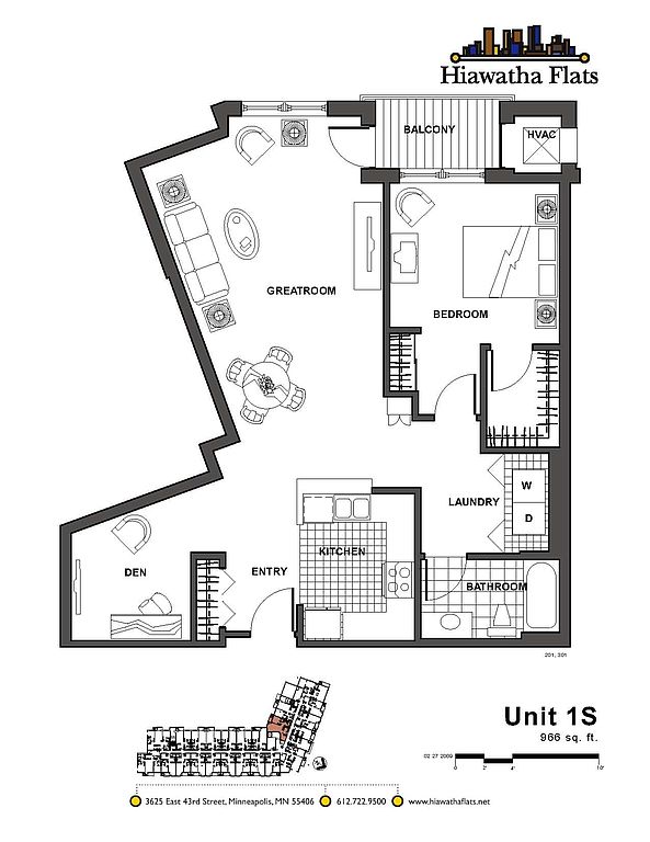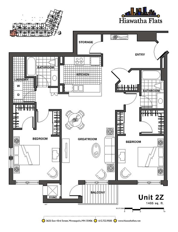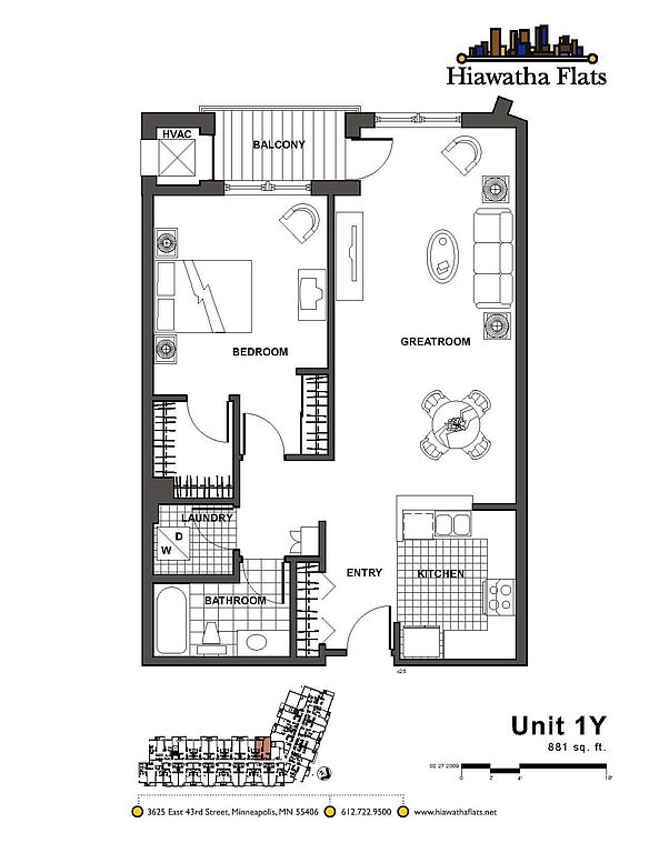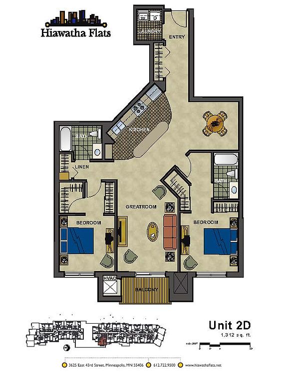 Newly remodeled apartment homes in an amenity galore building located in South Minneapolis! Located just 2 blocks from the 46th Street Light Rail Station, you are just moments away from downtown Minneapolis, Uptown, Highland Park, and Bloomington! Located between downtown Minneapolis and the Minneapolis/St. Paul Airport & Mall of America, you are within walking distance to Minnehaha Falls and Minneapolis' finest lakes and bike trails. Designed for contemporary living, each spacious apartment has generous closets, 9-foot ceilings, washer and dryer in-unit, natural maple cabinets and trim, stainless steel appliances, central media panel pre-wired for cable, telephone, and internet service. The majority of our homes have private balconies, some with downtown Minneapolis views. You will also appreciate heated underground parking for vehicles and bicycles, along with a car wash bay. The entire first level is dedicated to amenities, including a resort-style indoor pool and spa, sauna, fitness center, social party rooms, club room with fireplace, game room, and home theatre entertaining room. Visit us today and experience the beauty and convenience of Hiawatha Flats!