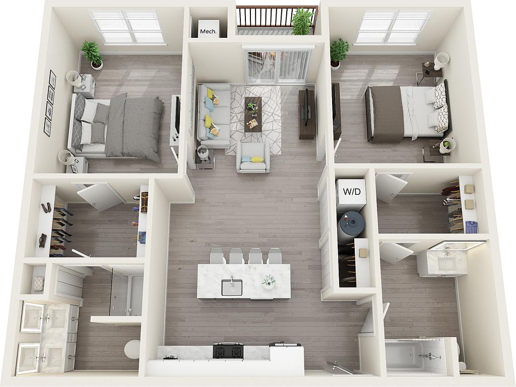 Generous quartz countertopsGlass-enclosed showersLarge custom closetsEnergy efficient stainless appliances