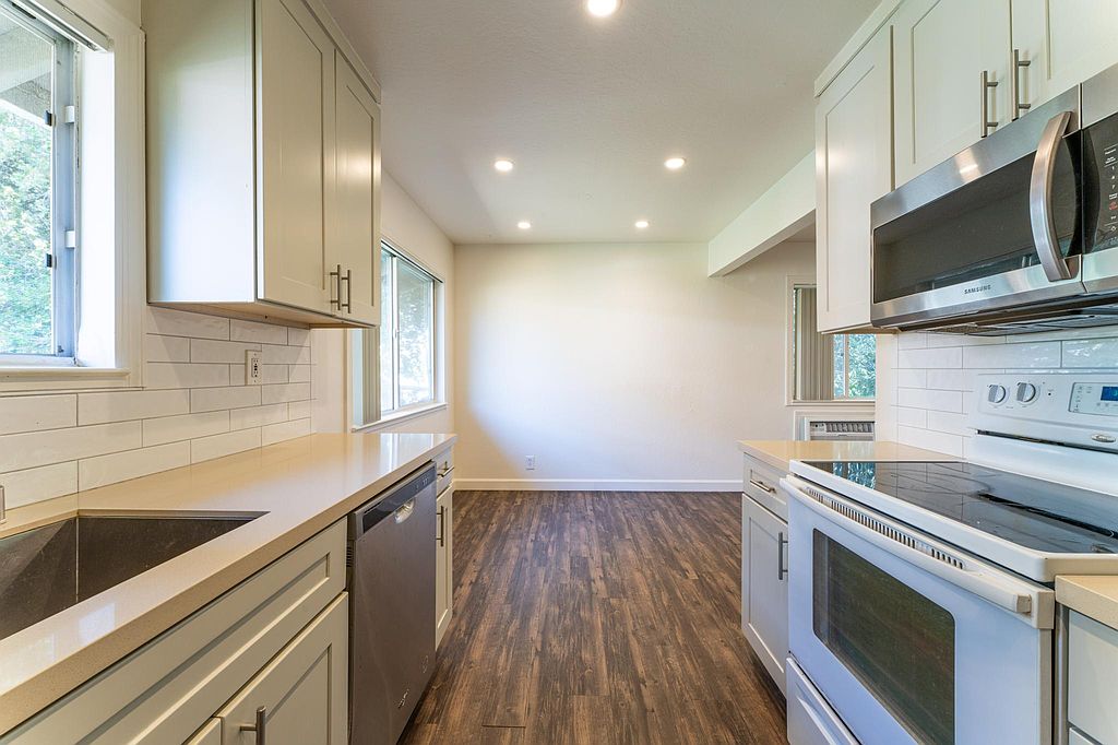 - Kitchen with granite countertop, stainless steel appliances