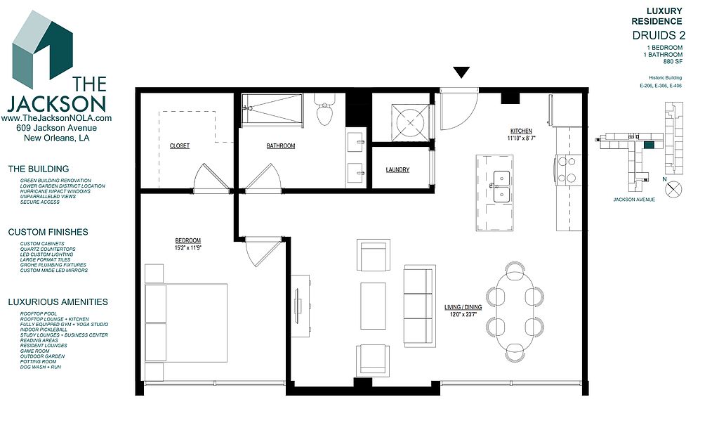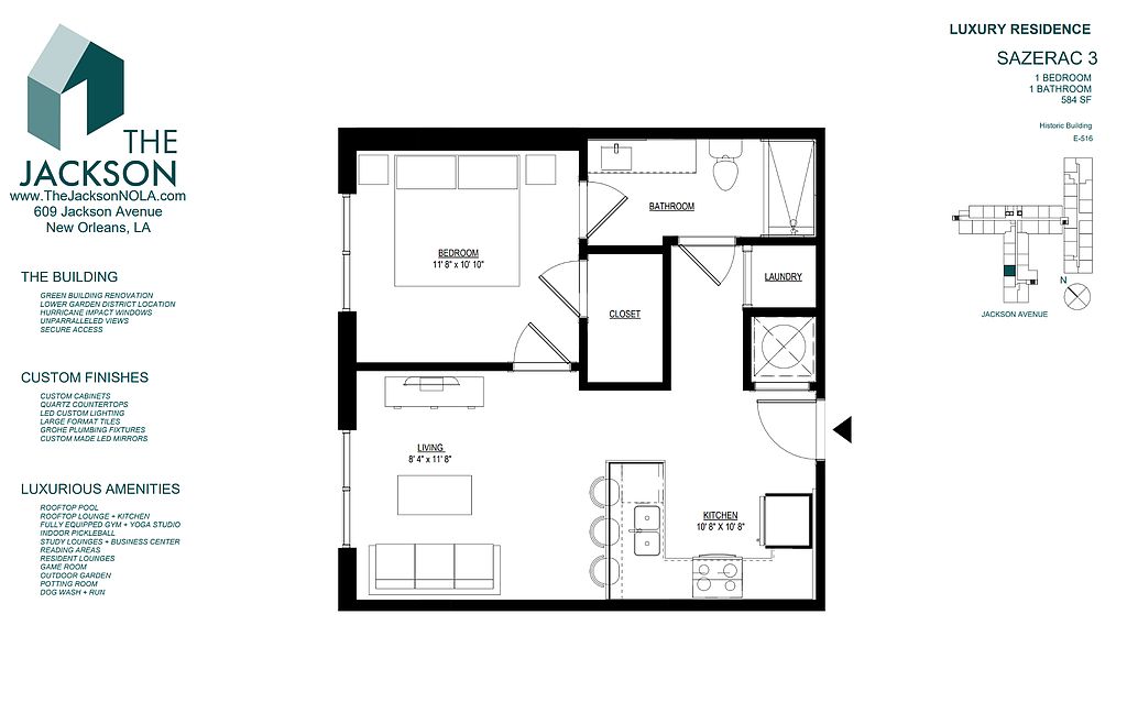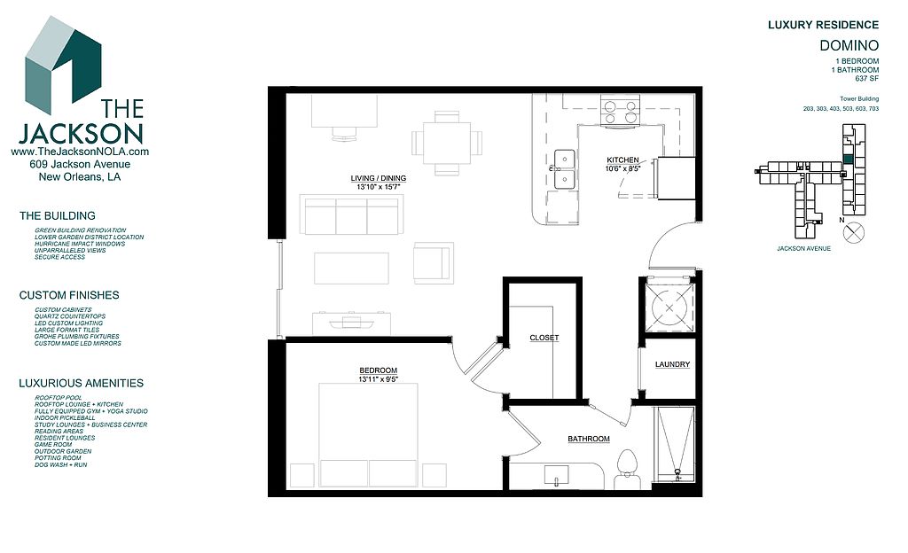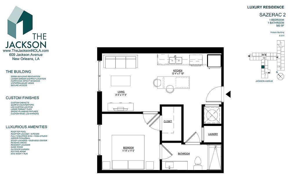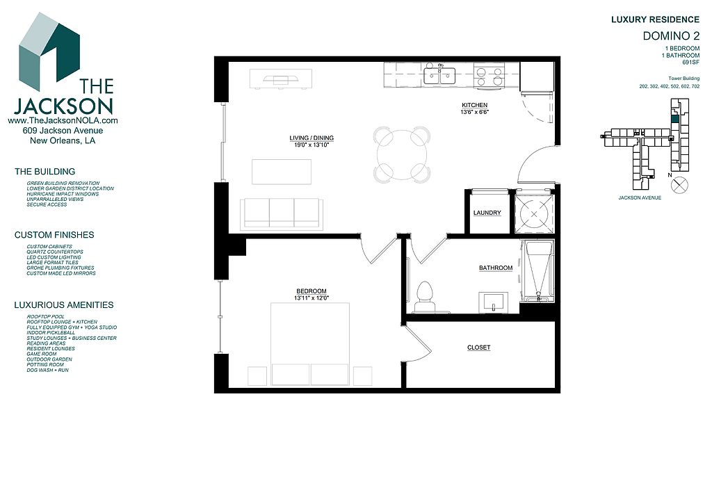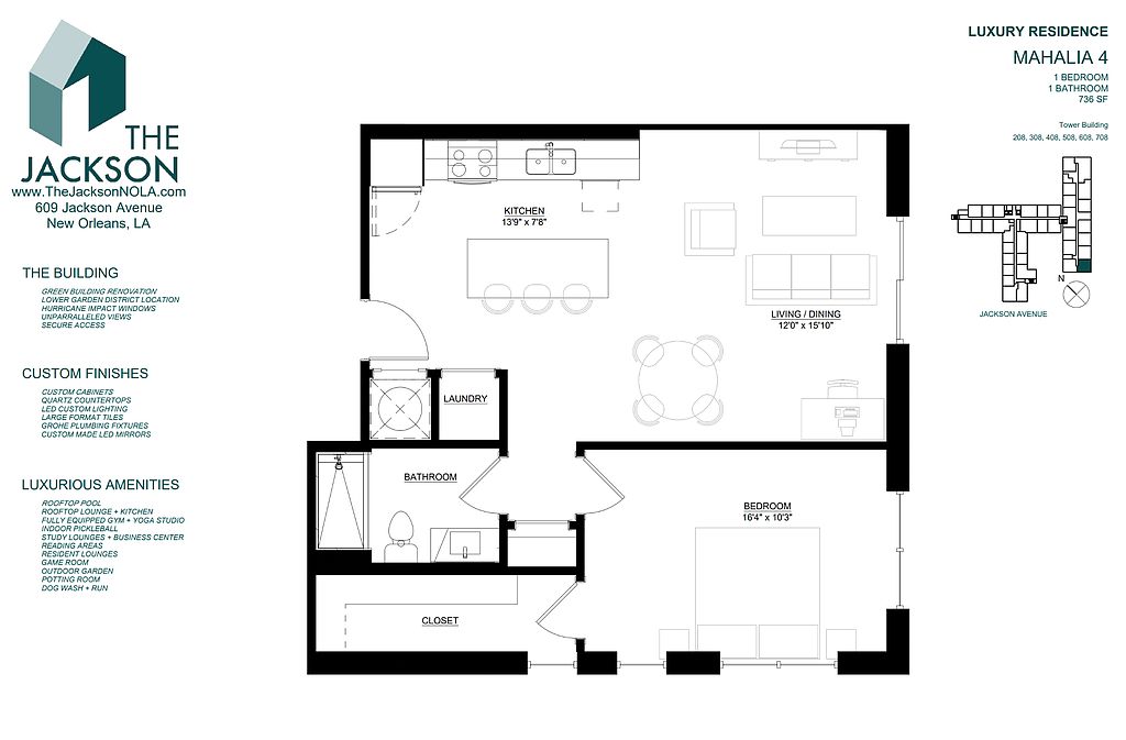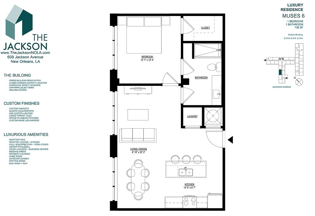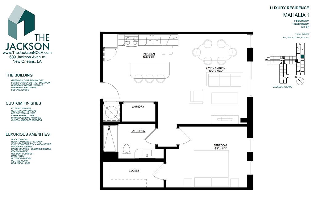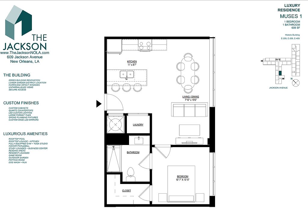 Discover luxury one- and two-bedroom apartments at The Jackson, located in the historical Lower Garden District. Just two blocks from the Mississippi River and four blocks from Magazine Street, you'll be immersed in local art, cuisine, and culture.