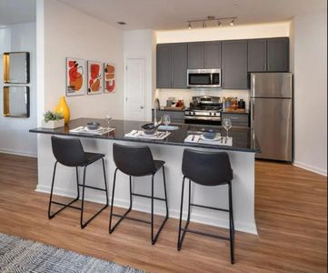 Vinyl flooringModern kitchenWhite cabinetsGenerous closet spaceStainless steel appliances