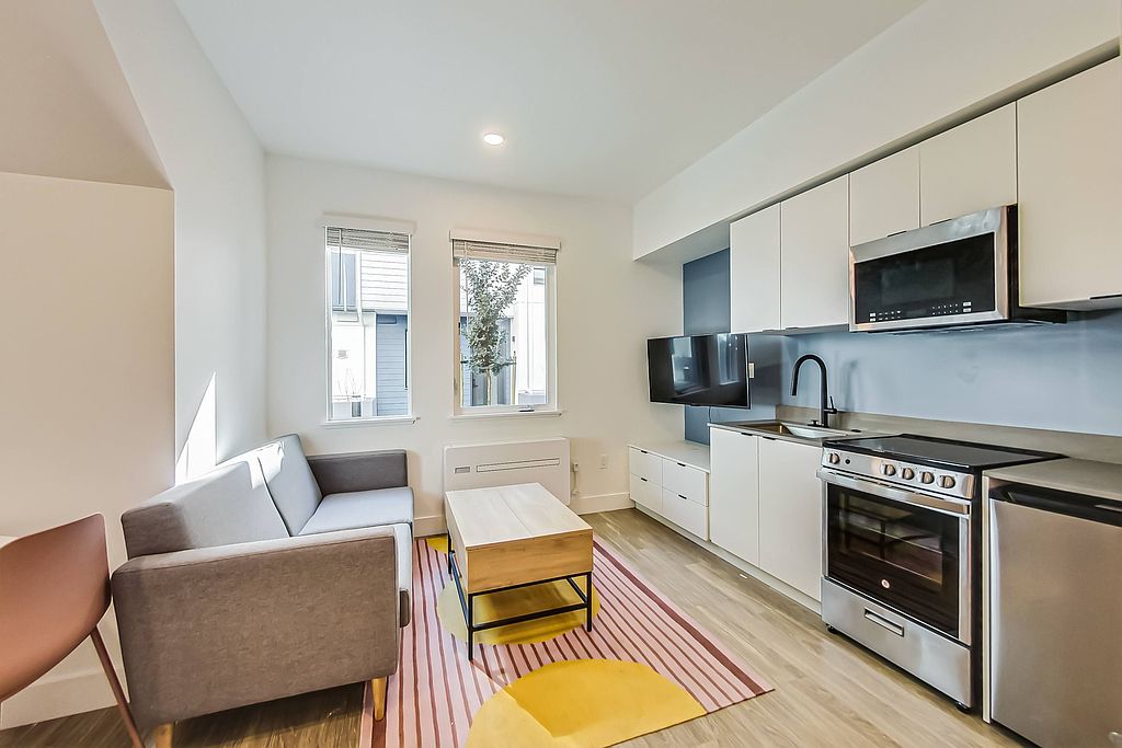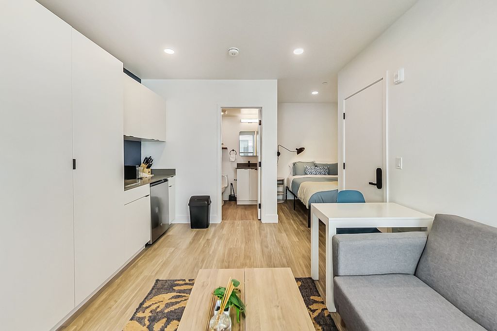 Fully furnished studio apartmentsSmart tvKitchenette with quartz countersSpacious built-in storageLatch keyless entryComfortable sofaLuxurious nectar mattress