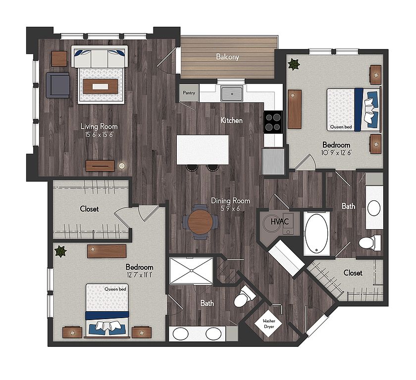 Now for the apartments. Each floor plan boasts gourmet kitchens with quartz countertops and stainless steel appliances. Love natural light and fresh air? Oversized windows let the sunshine in and a private balcony is perfect for morning coffee or evening cocktails. Then there's the closets. So many closets. Pantry closet, linen closet, walk-in closets (for all those new finds). You'll also enjoy access to a 24-hour fitness center, grilling stations, a media lounge and, the best part, worry free maintenance.