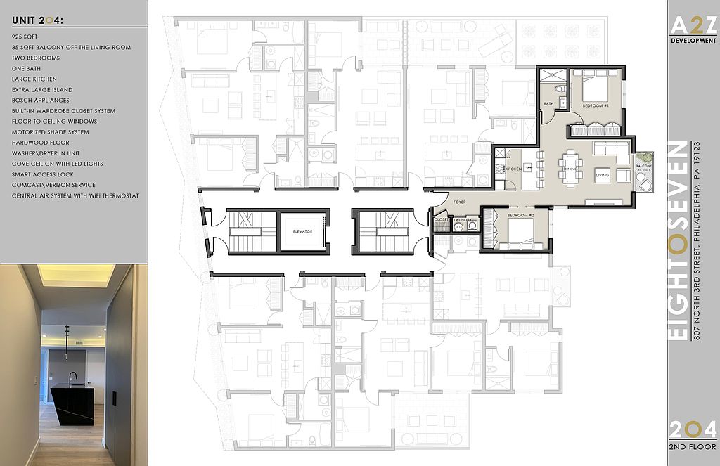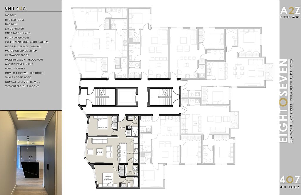 807 N 3rd Street is a newly built 32 unit apartment building unlike any other in the heart of Philadelphia's best neighborhood. The buildings design and amenities separate it from other similar sized buildings, the 807 experience is simply better. The building has a gym, roof deck, meeting/study room, lounge with big screen TV and pool table, parking, and dog washing station. The apartments are all unique layouts and each offer their own special features.