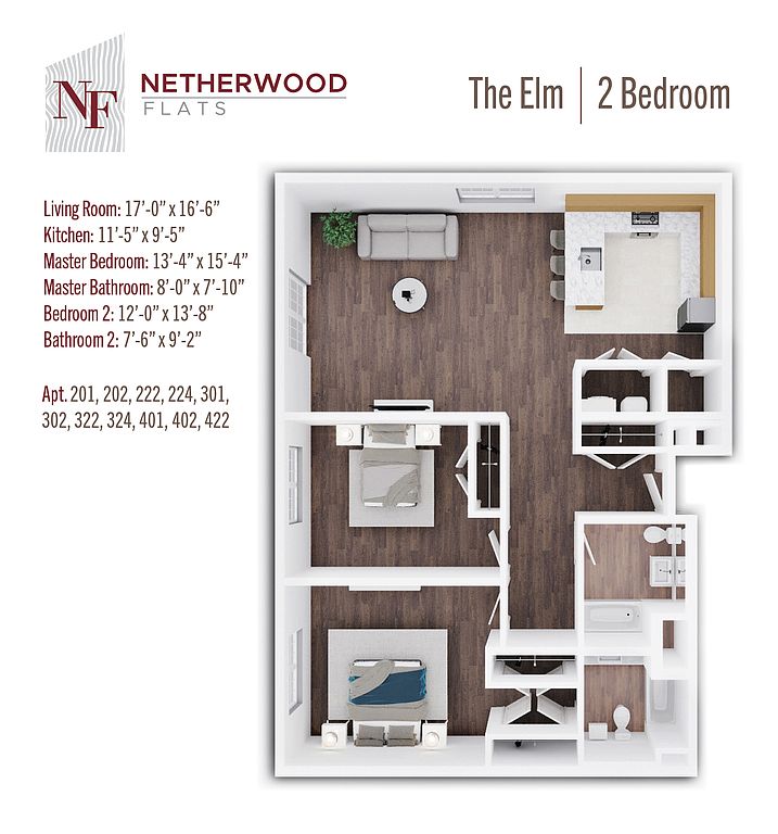 *The Flats Collection Back to School 2025 Promotion is only for new tenants at Netherwood Flats. New prospective tenants must specifically refer to this promotion during initial contact with a leasing agent. This offer cannot be combined with any other leasing offer, promotion, or discount. This promotion starts on October 1, 2025, and expires on October 31, 2025. This promotion is only applicable to two-bedroom apartments with a lease commencement date no later than December 1, 2025. All leases are subject to credit approval. A 26-month term is required to receive the 2 months free promotion. Credit will be applied once security deposit has been paid, tenant taking possession of the unit and first month of rent owed to the property owner is paid upfront. $599 Security Deposit specifically limited to credit scores of 720 and above by TransUnion Credit Bureau. 829 South Urban Renewal reserve the right to withdraw this offer at any time. All prices, size of apartments, and fees are subject to change.*
