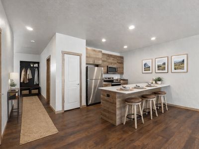 One-car garageLvp flooringBrown soft closed cabinetsFull-size washer and dryerStainless steel appliances