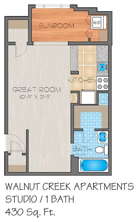 Here at Walnut Creek, a River Ridge apartment community, we offer studio, one and two-bedroom apartment homes for rent with a full kitchen appliance package, plush carpeting, and private patios or sunrooms with faux wood flooring. Vaulted ceilings with skylights, personal intrusion alarms, fireplaces, and washers/dryers are standard in many of these magnificent apartment homes.