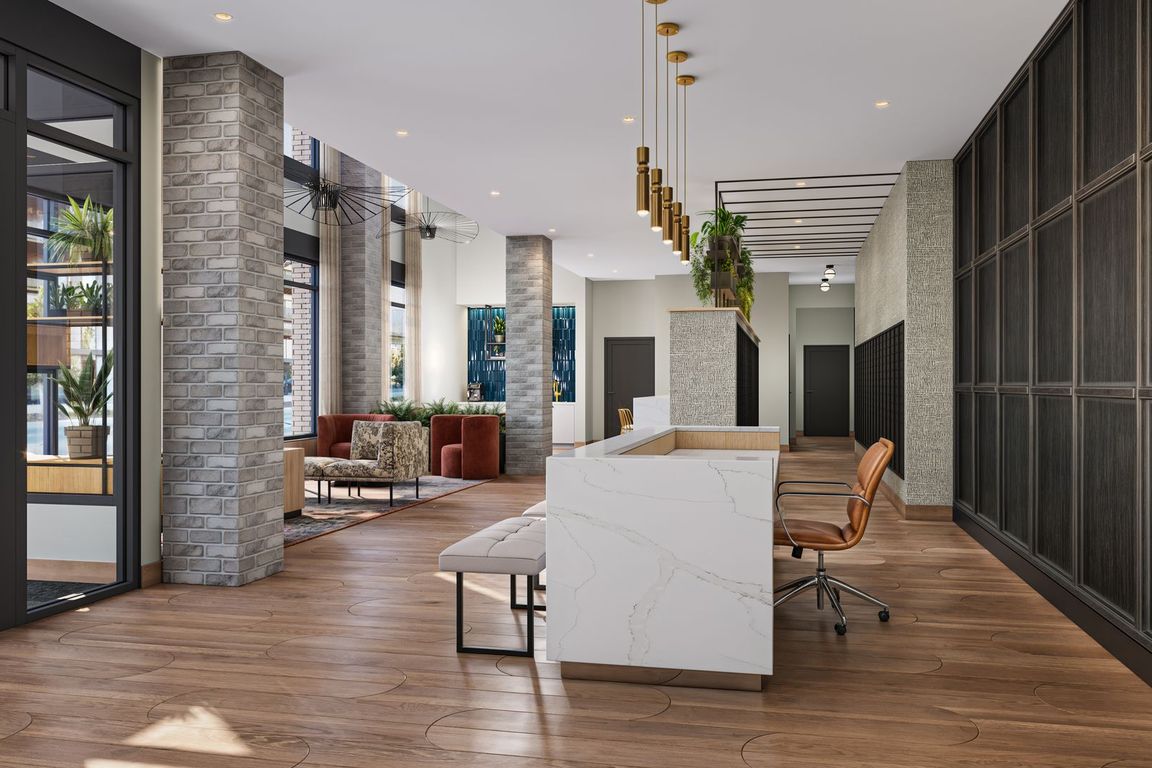 Community amenities: fitness & yoga studio, third-story amenity deck with grilling stations and spa, grab-and-go mini market, grand lobby with dedicated mail and package room, bike storage, community clubroom with kitchen and fireplace, multi-sports simulator, pool table, outdoor courtyard, exclusive seventh-floor amenity deck and clubroom and makers crafting room.