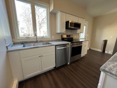 The apartment is a 2-bedroom, 1-bath, and fully renovated. The kitchen has been updated with stainless steel appliances, including a microwave and dishwasher. Both bedrooms have double closets for ample storage. The apartment has a heat pump for both heating and air conditioning.