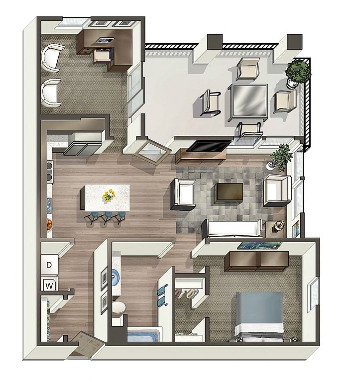 Upscale interiorsLush towering treesBrand-new luxury apartments