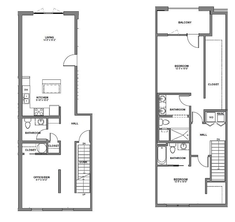 Two Bedroom Residences: These residences feature a distinctive two-story layout, with the main living space including a den and powder room thoughtfully positioned on the first floor. Upstairs, two spacious en-suite bedrooms with large walk-in closets provide privacy and comfort. The primary bedroom is enhanced by a private balcony, creating a perfect personal retreat.