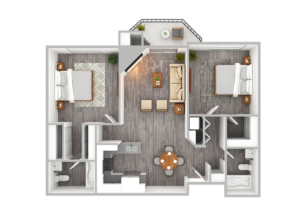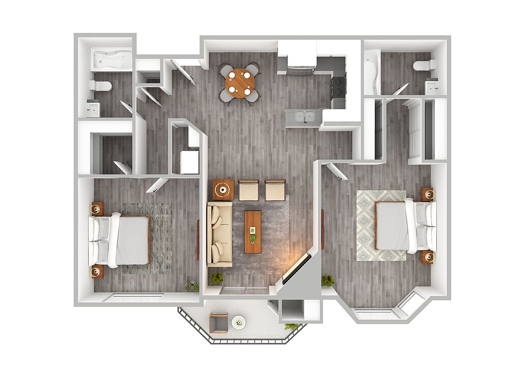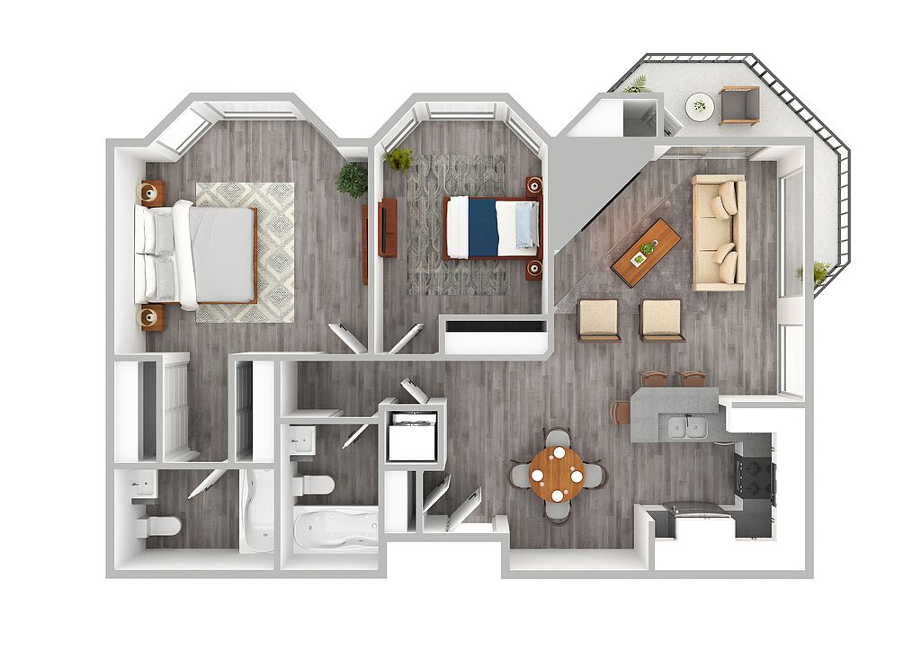 Your deluxe two-bedroom, two-bathroom home comes with wood-style flooring, stainless steel appliances, and quartz counters for a modern look. Every home comes with a fireplace, in-home laundry, and air conditioning.