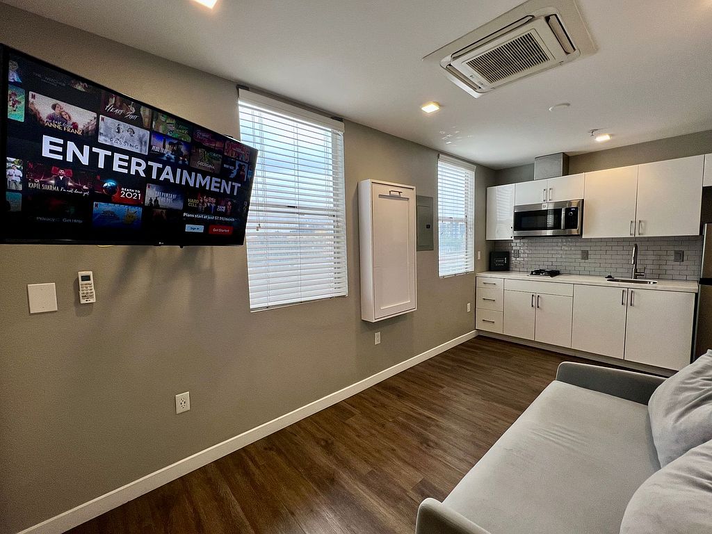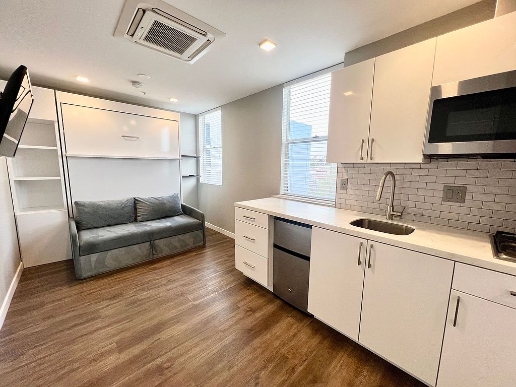 Gas stove topFoldout tableAlexa in unitSecured buildingsVinyl plank flooringHassle-free efficient living spaceQueen size murphy bed