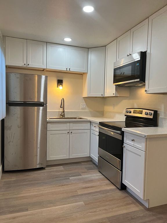 Updated appliances and fixturesLight wood-style flooringModern white cabinetry