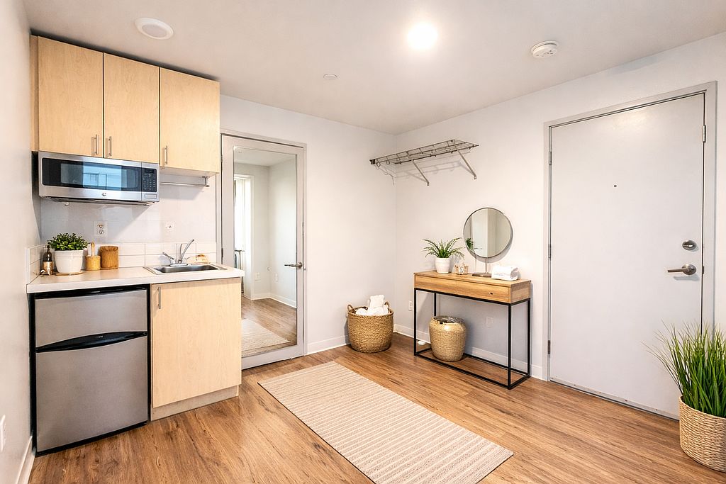 Each micro includes a kitchenette and amazing modern finishes. The building offers a rooftop deck with views of the Olympic Mountains, full-size communal kitchens on each floor, card-operated laundry facilities, and beautifully maintained landscaping. The smaller size of the units ensures a smaller carbon footprint and an opportunity to live near the action Seattle has to offer, without paying the high price!