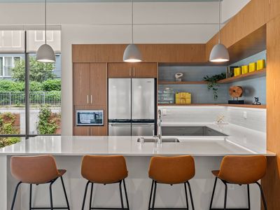 Quartz countertopsStainless steel appliancesSleek finishesHardwood-style flooring