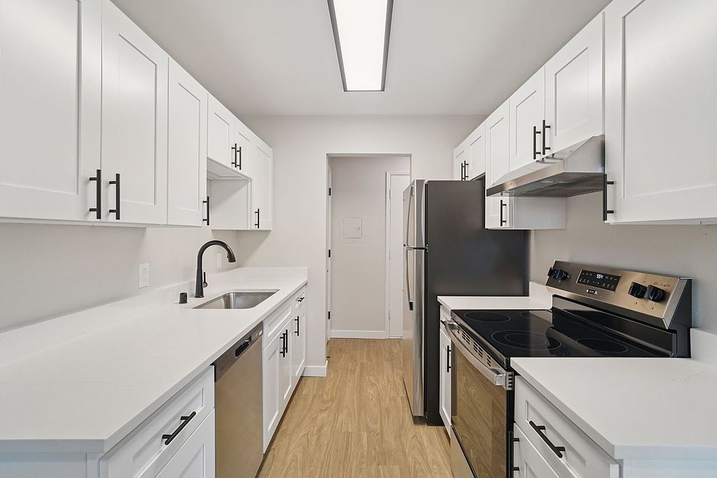 Sleek stainless steel appliancesContemporary designModern unitAbundant natural lightHigh-end finishes